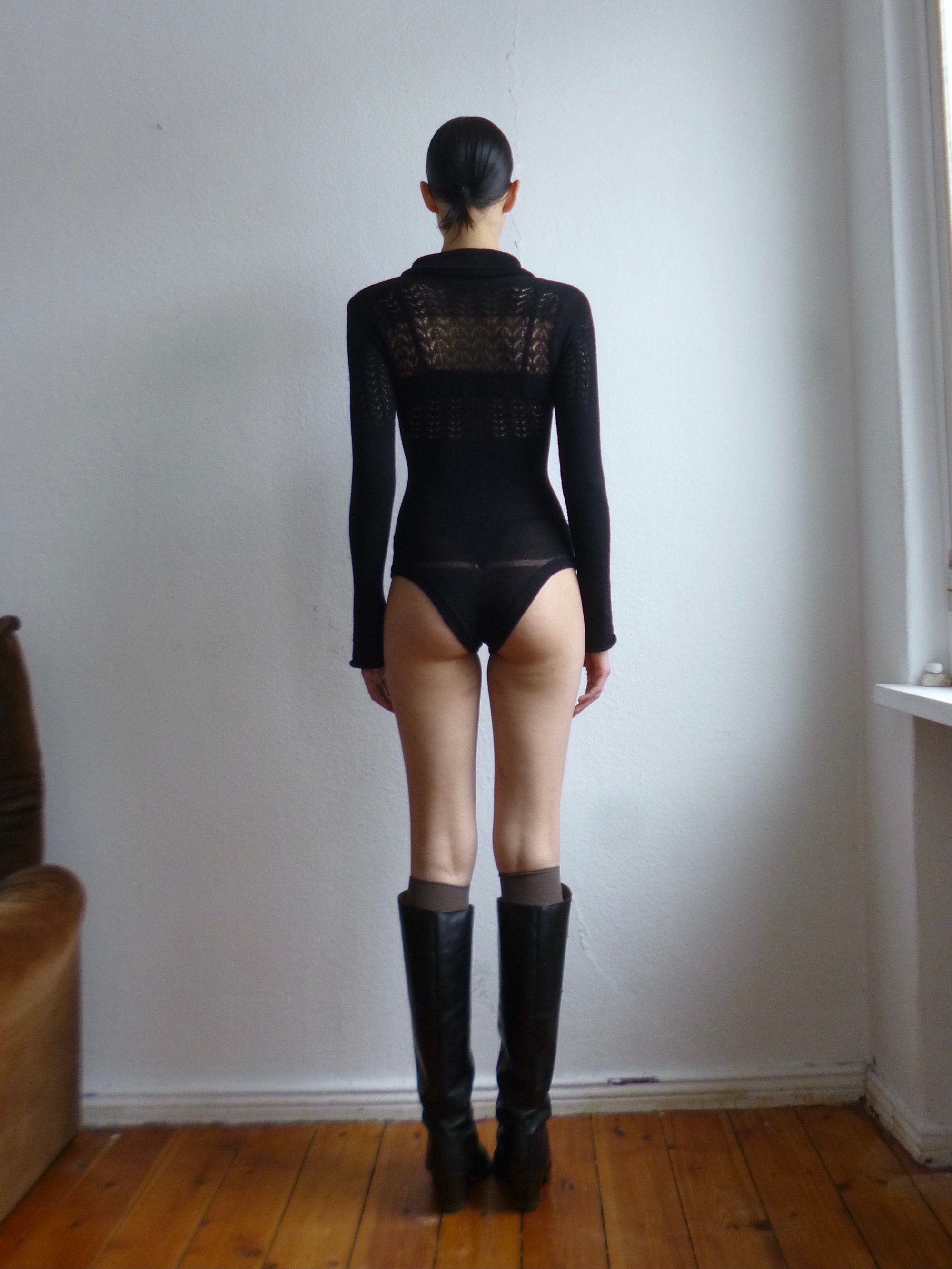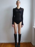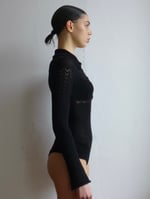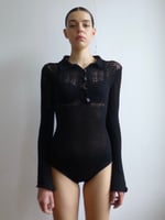 Polo collar bodysuit with lace bust and sleeves knit in black rayon yarn. Very light and comfy to wear.