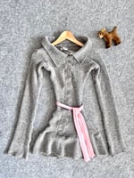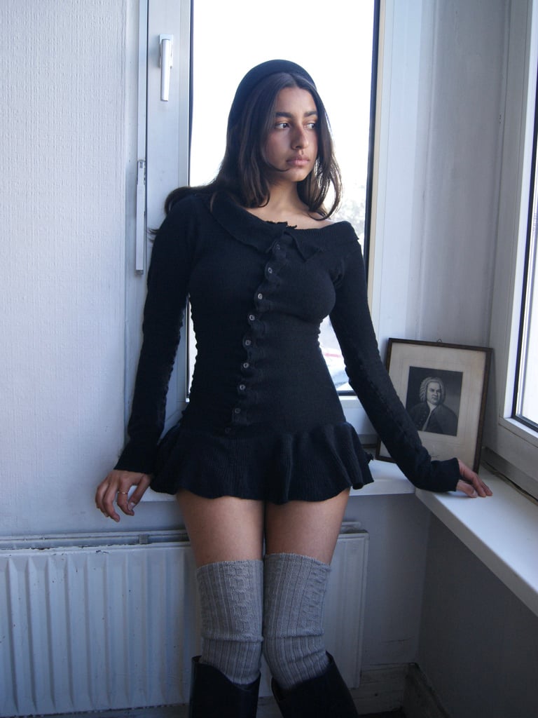 Knit minidress with collar, softly flared skirt and twisting button up front.