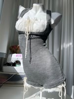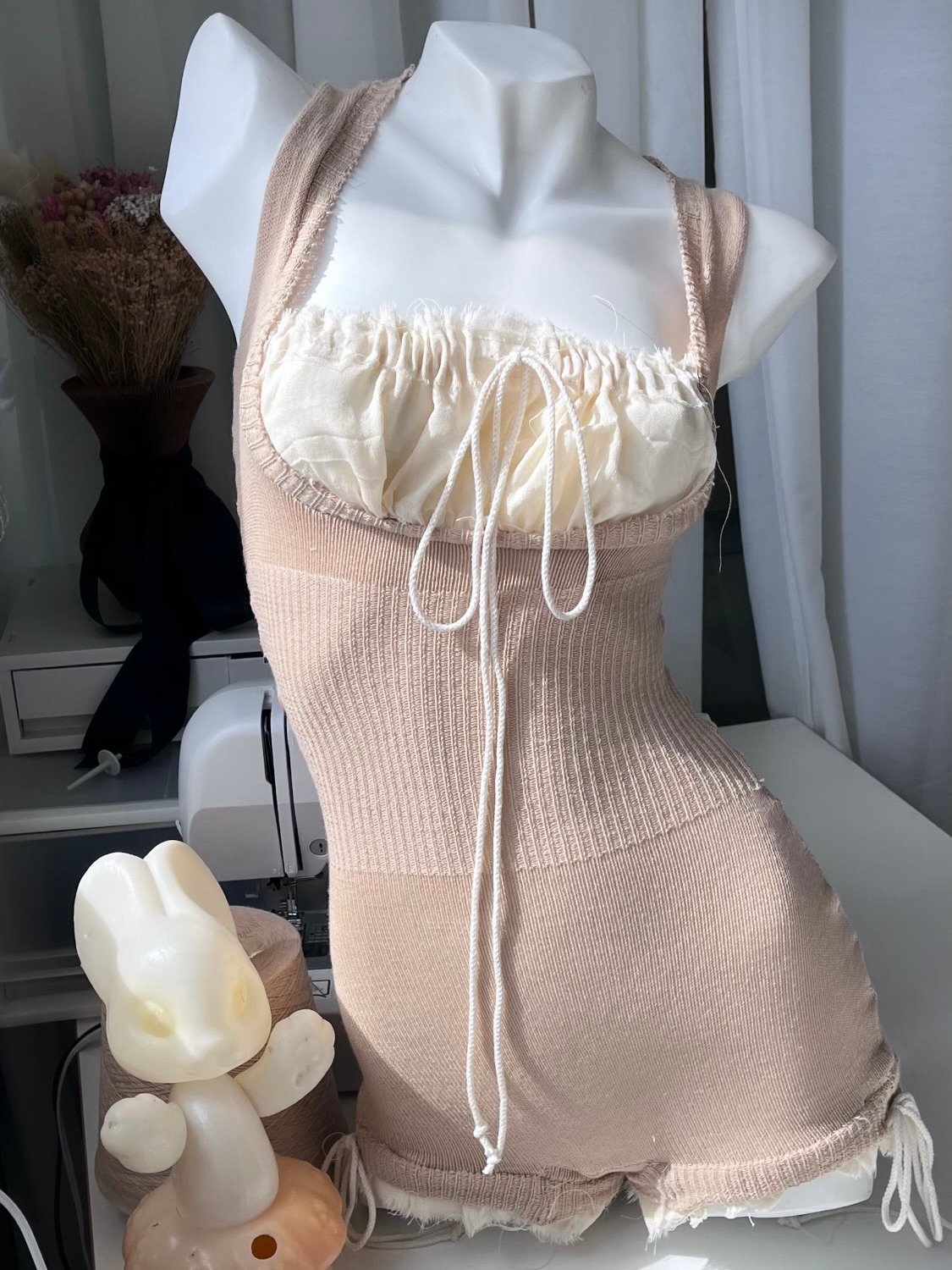 Knit onesie with snatched rib waist and white cotton gauze bust.