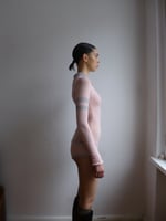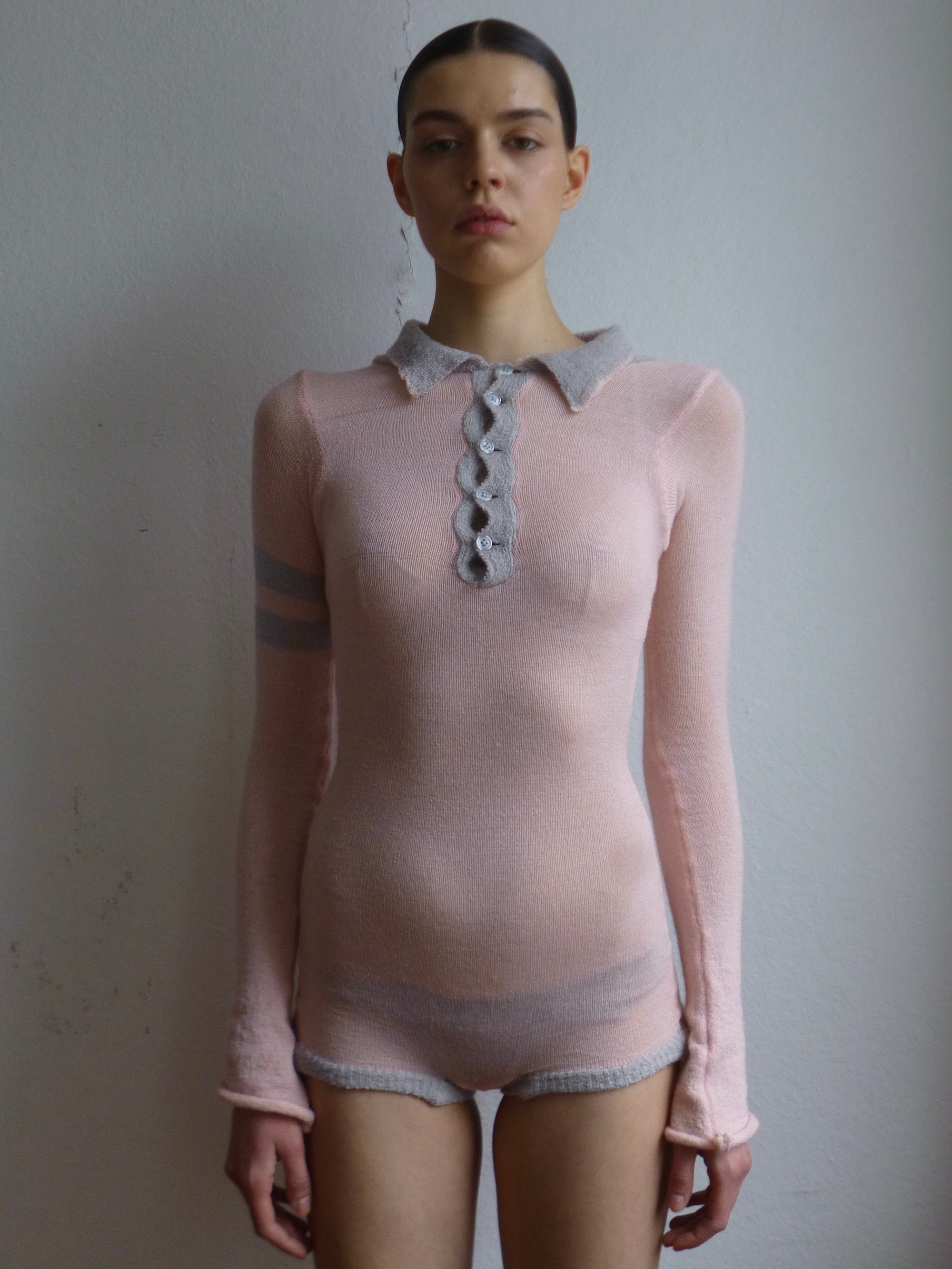 Polo collar onesie knit in pink merino yarn. Very soft and comfy to wear. Grey wool collar and details.