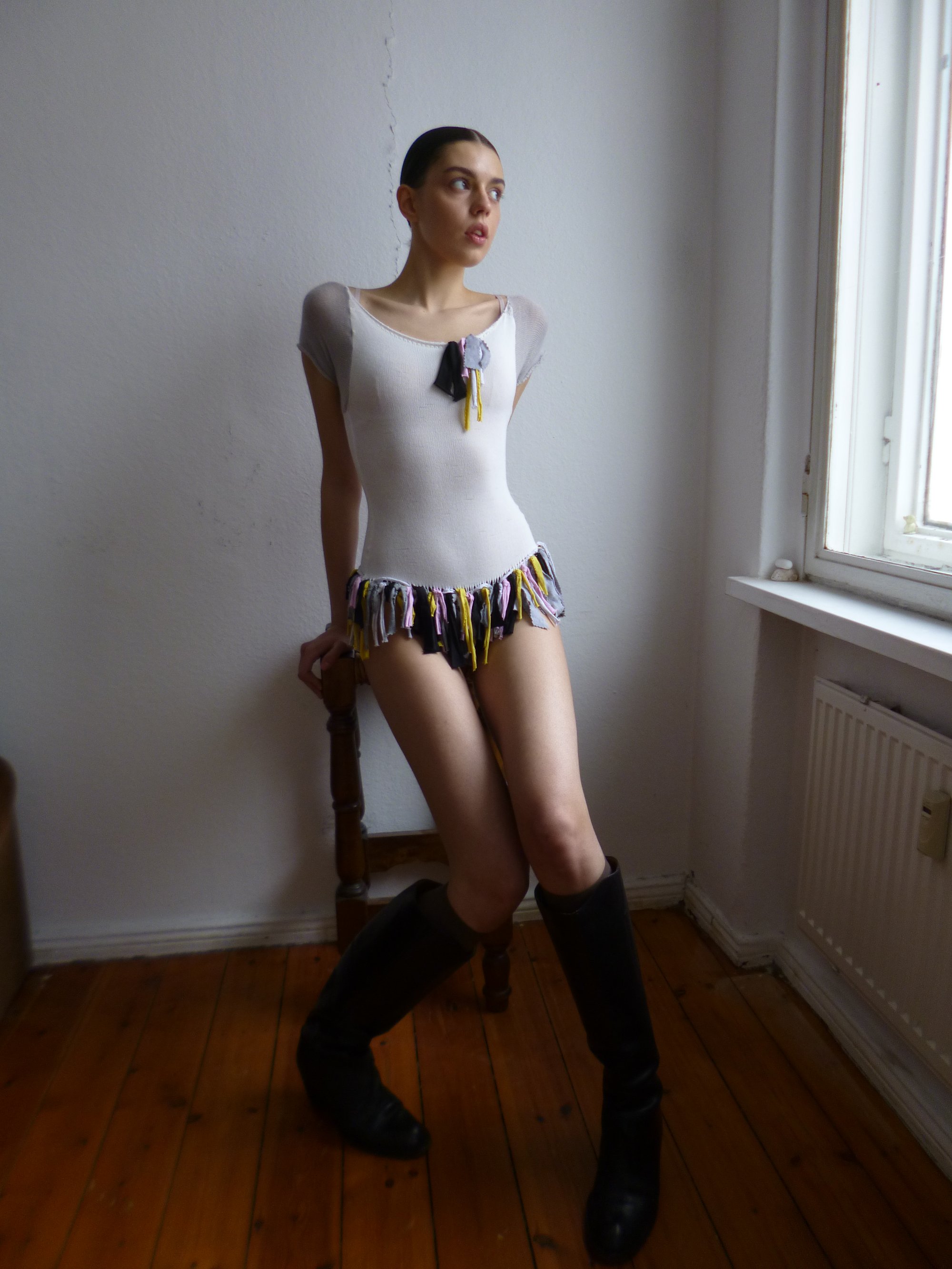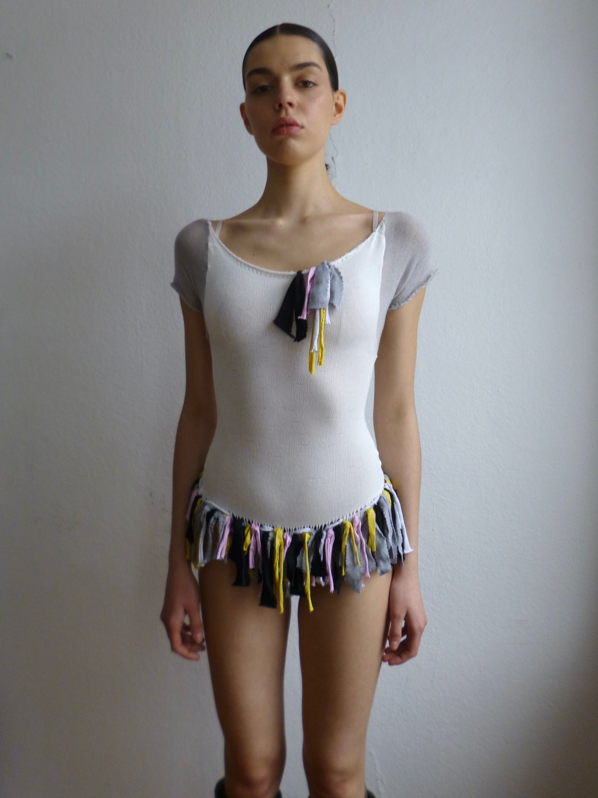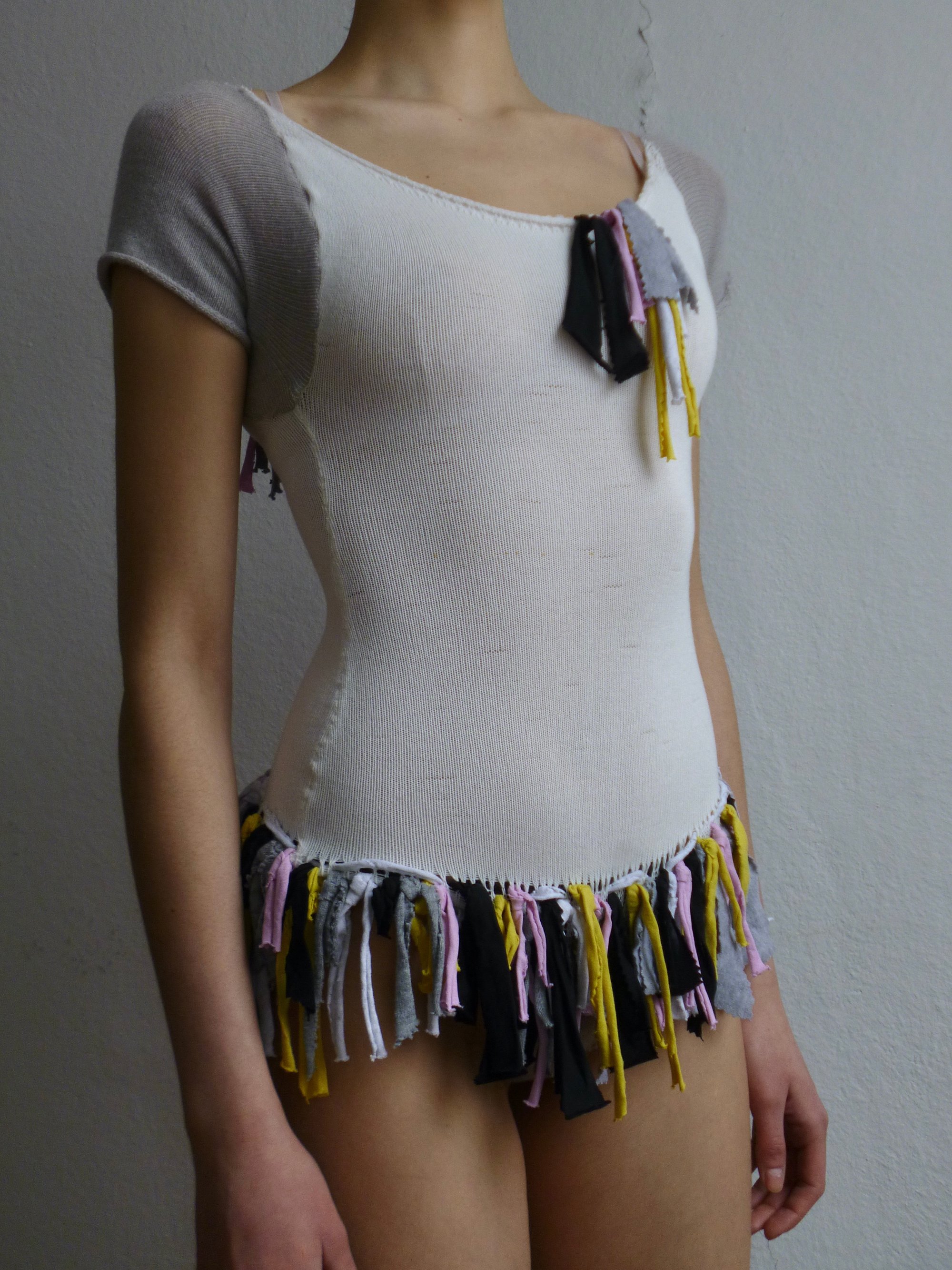 Raglan sleeve bodysuit knit in white rayon yarn with grey wool sleeves, with tassles in black, yellow, pink, white and grey cut from t-shirts and leftover fabrics.